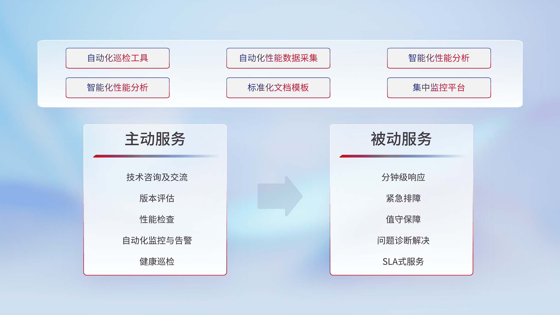 智能化工具和标准化文档,,保障服务质量,,,提供主动服务(包含技术咨询、、、版本评估、、性能检查、、、自动化监控与告警、、、、健康巡检)和被动服务包含(分钟级响应、、、紧急排障、、、值守保障、、、问题诊断解决、、、SLA服务)。。。